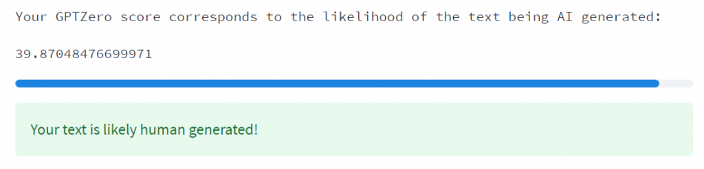 GPT Zero correctly concluded that the text was AI-generated.