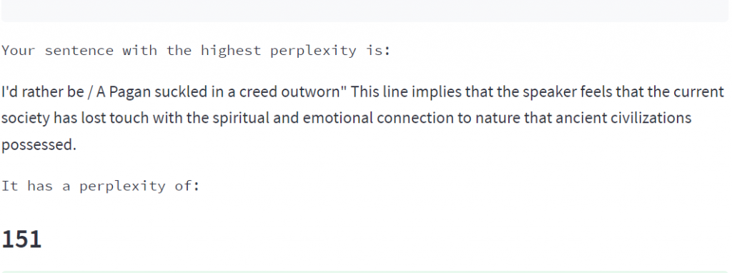 In the sample text, GPTZero detected that the close reading of Wordsworth’s poem had a comparatively low rate of perplexity in several instances (see Figure 1) – an indication that certain parts of the text were not written by a human.